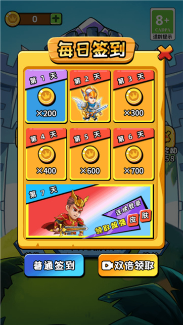 2、在每日签到界面,点击【双倍领取】按钮获取丰富奖励(如金币、角色等),坚持签到第7天可领取强力皮肤,为游戏积累资源与优势。