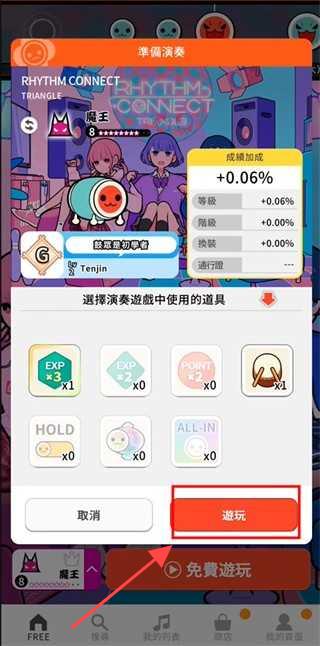 1、在游戏准备界面,看到提示,按需选择道具,确认后点击【游玩】或【免费游玩】按钮进入游戏。