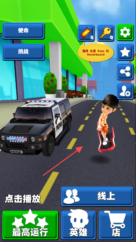 1、进入游戏界面后点击【点击播放】开始游戏,开启滑板逃亡之旅。
