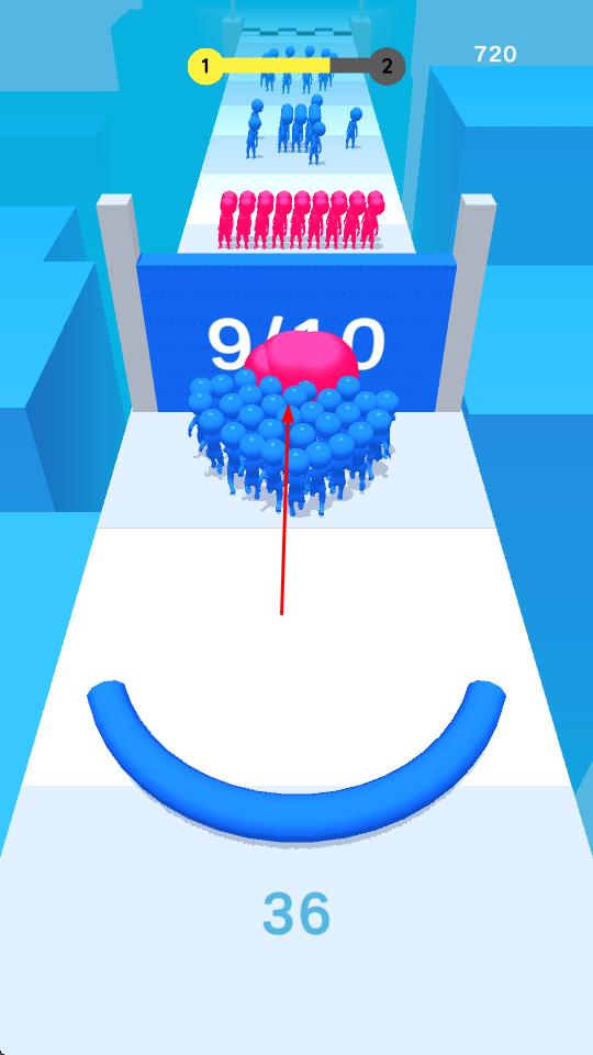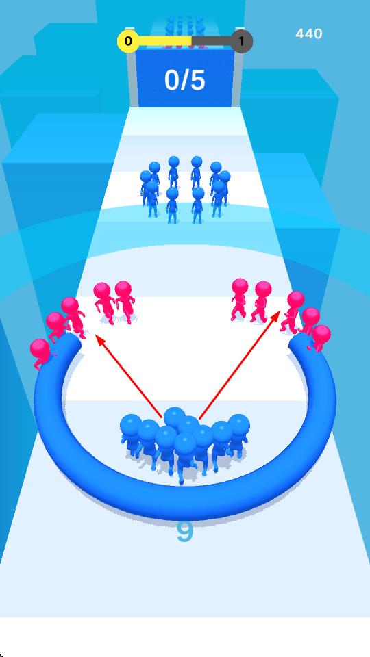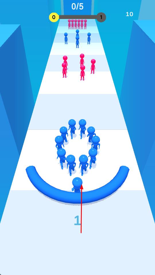 1、玩家操控蓝色小人,通过滑动屏幕等操作,在道路上前进并吸收沿途的蓝色小人,壮大队伍规模。