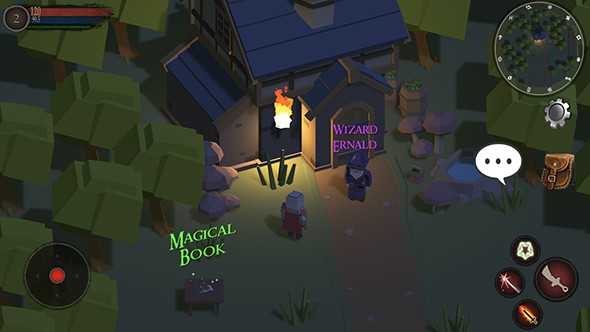 2、进入游戏场景,与之对话接取任务,留意周围可交互物品,利用屏幕下方技能按钮应对可能出现的情况。