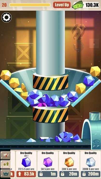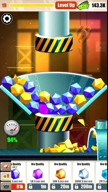 3、液压设备养成体系:通过粉碎物品获取金币与能量,可升级液压机的压力等级、碾压速度与解锁新模具(如齿轮碾压、激光切割)。