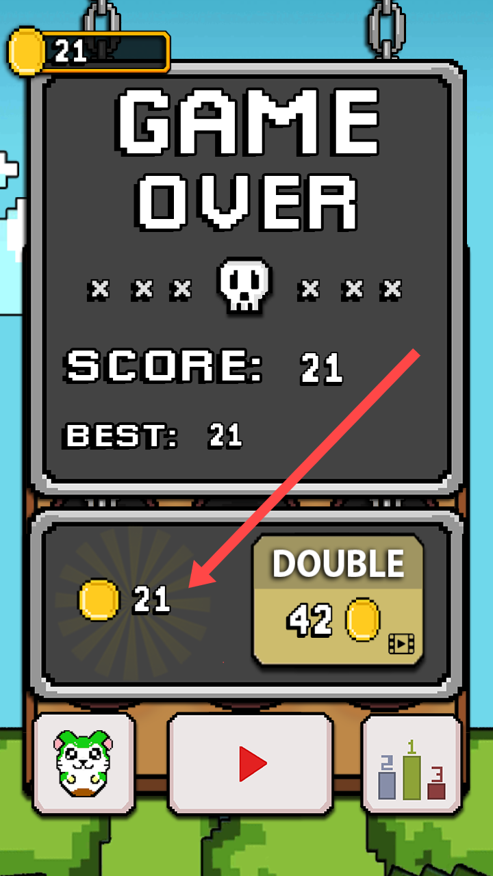 3、游戏结束后,查看【SCORE】显示的分数及获得的金币,可选择是否通过DOUBLE翻倍金币。