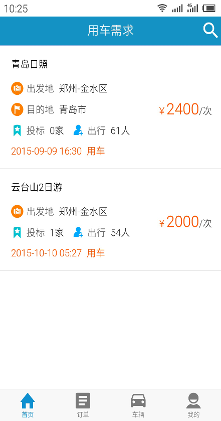 3.用车需求:汇聚旅行社、企业、自由组织和个人用户等各个群体发布的用车需求,让你不再被动等待用车用户,您可以主动的去寻找用车用户。
