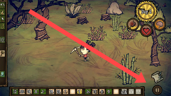 2、操控角色沿箭头方向在森林场景移动,使用工具(如镰刀)采集竹子、木材等资源。