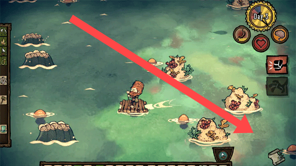 3、当到达水域场景(木筏、船的画面),按箭头指引驾驶船只探索岛屿,收集蛋、植物等资源。