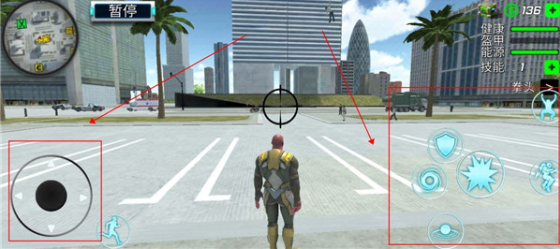 2、游戏界面,左边的摇杆是控制方向的,而右边则是我们的各种技能。
