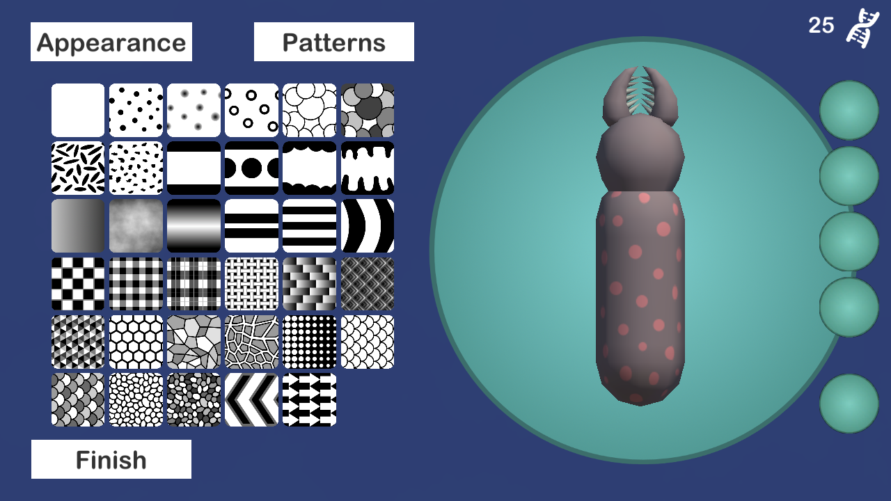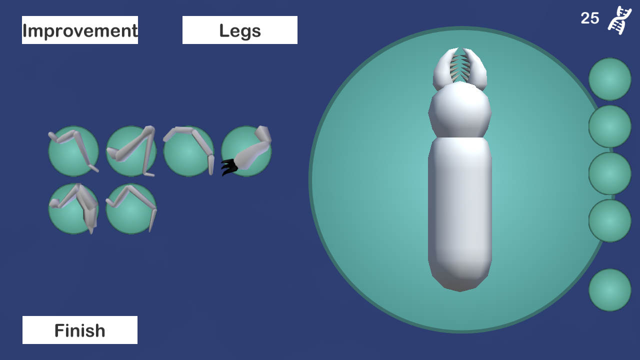 2、进入生物编辑界面,选择不同的肢体部件来改造生物外形,编辑完成后点击【Finish】保存。