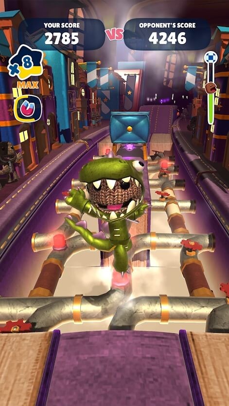 1、经典角色演绎:操控标志性麻袋男孩开启冒险,独特形象带来亲切感,在充满创意的赛道上展现酷跑魅力。