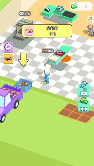 1、画面中有任务提示【拿起虾】,显示了卡通风格的游戏场景,玩家需要根据提示进行与任务相关的操作。