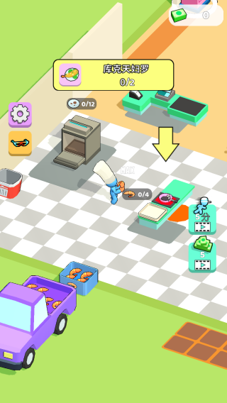 2、呈现出卡通风格的超市经营场景,画面中有任务提示【库克天妇罗】,还包含人物、设备、车辆等元素,该游戏属于模拟经营类。