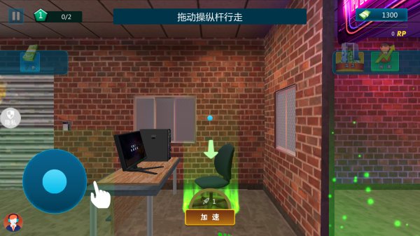 1、画面呈现室内场景,根据操作提示【拖动操纵杆行走】,可通过操纵杆控制角色移动,玩家需按提示操作角色在场景中进行互动或推进游戏进程。