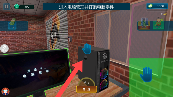 2、画面展示了一个室内场景,上方有操作提示【进入电脑管理并订购电脑零件】,玩家需按提示进行电脑管理及零件订购操作来推进游戏。