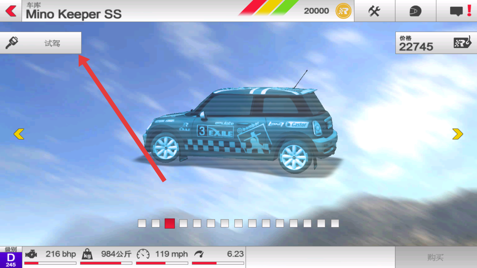 2、点击车库,车子都需要用货币购买,如果想要提前了解性能,左上角的按钮可以试驾。