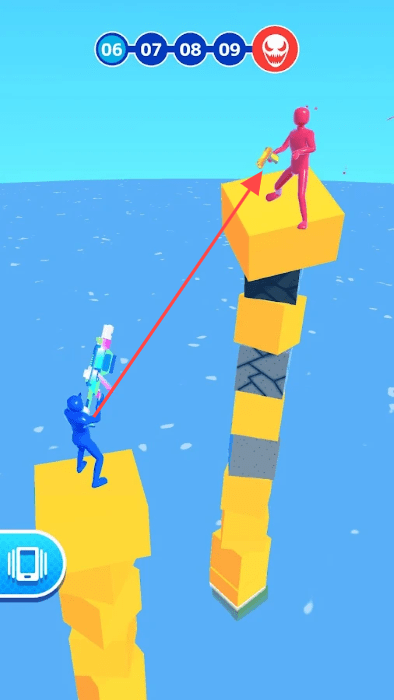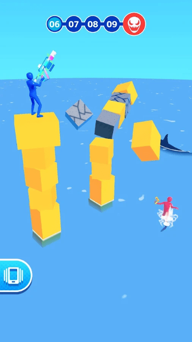 2、利用射击破坏红色小人所在的方块堆叠结构,使其失去立足之地,掉入海中。