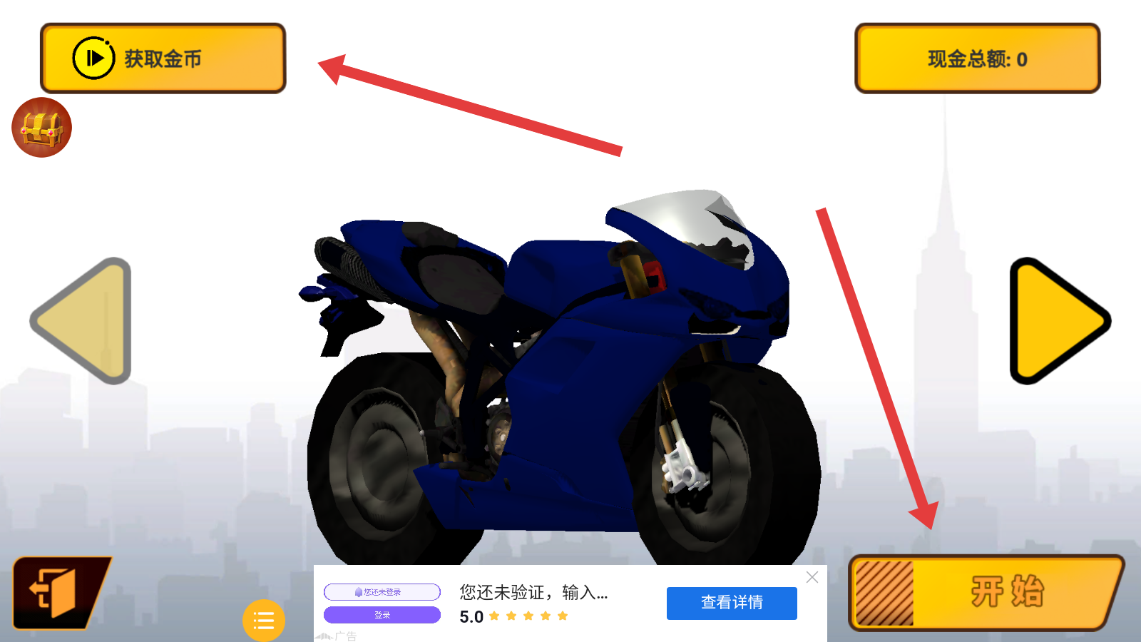 1、进入游戏,点击开始,选择一辆属于自己的摩托车,可以左上角点击获取金币。