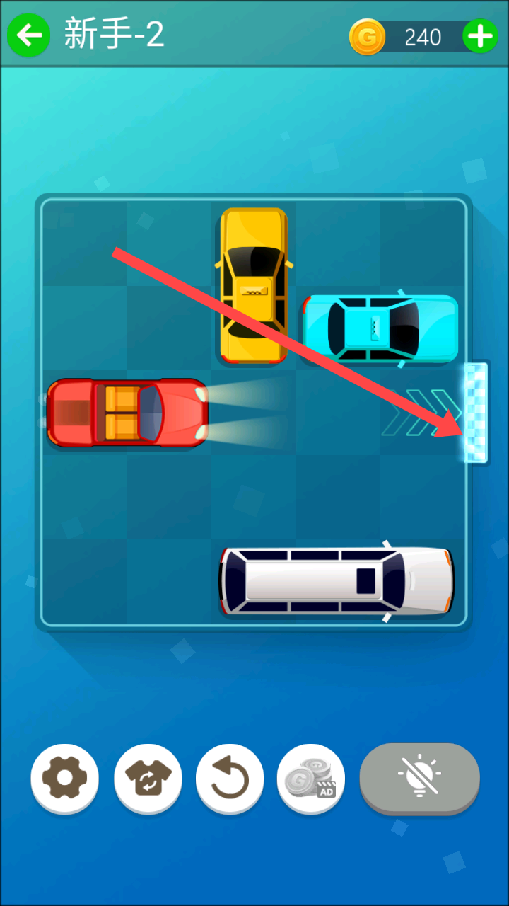2、在新手-2关卡里,注意红色箭头引导,避开阻挡的车辆,将目标车辆驶向出口标志位置。