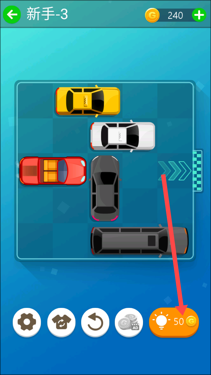 3、新手-3关卡若遇困难,点击右下角【50】金币的灯泡图标获取提示,帮助解决当前关卡难题。