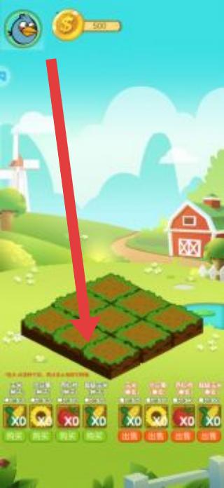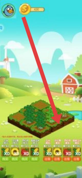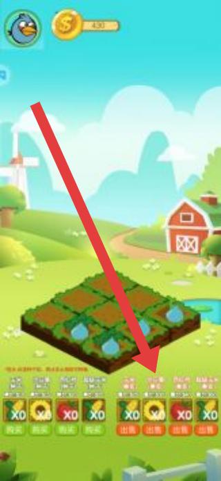 2、种植后,点击红色箭头指向的“出售”按钮,将成熟作物卖出,获取金币,用于扩大农场或升级设施。