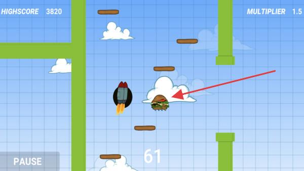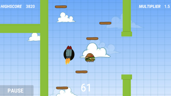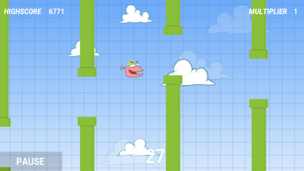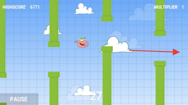1、进入游戏操控角色在云朵与平台间移动,躲避绿色管道障碍,上方“HIGHSCORE”显示高分,“MULTIPLIER”体现倍数,注意收集或躲避。