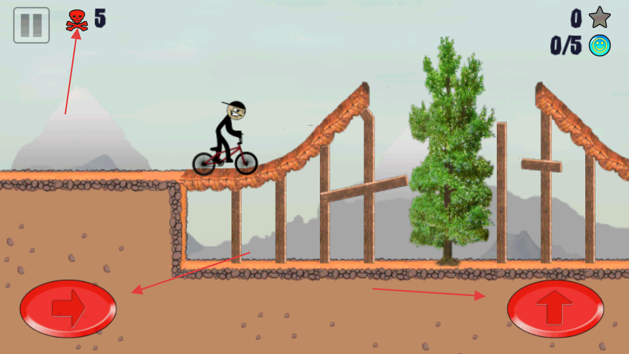 1、操控火柴人骑行:通过虚拟按键操控火柴人骑行,控制方向、速度,在起伏的山丘赛道上平稳前行,为完成特技任务做好准备。
