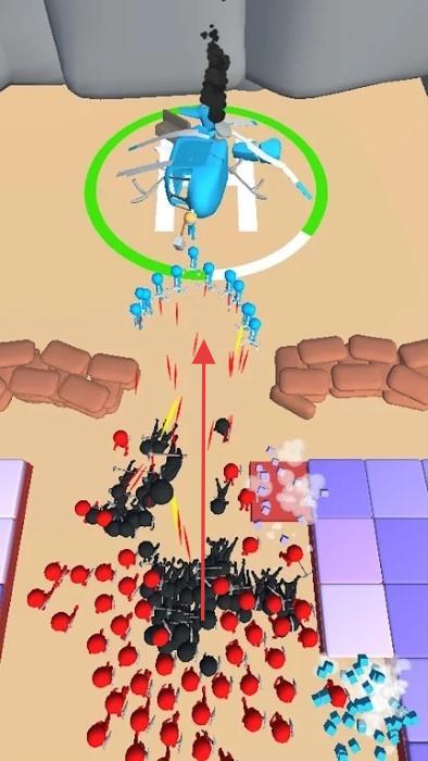 1、玩家操控蓝色小人及其队伍,利用坦克、直升机等载具,与红色敌人战斗,消灭敌方势力。