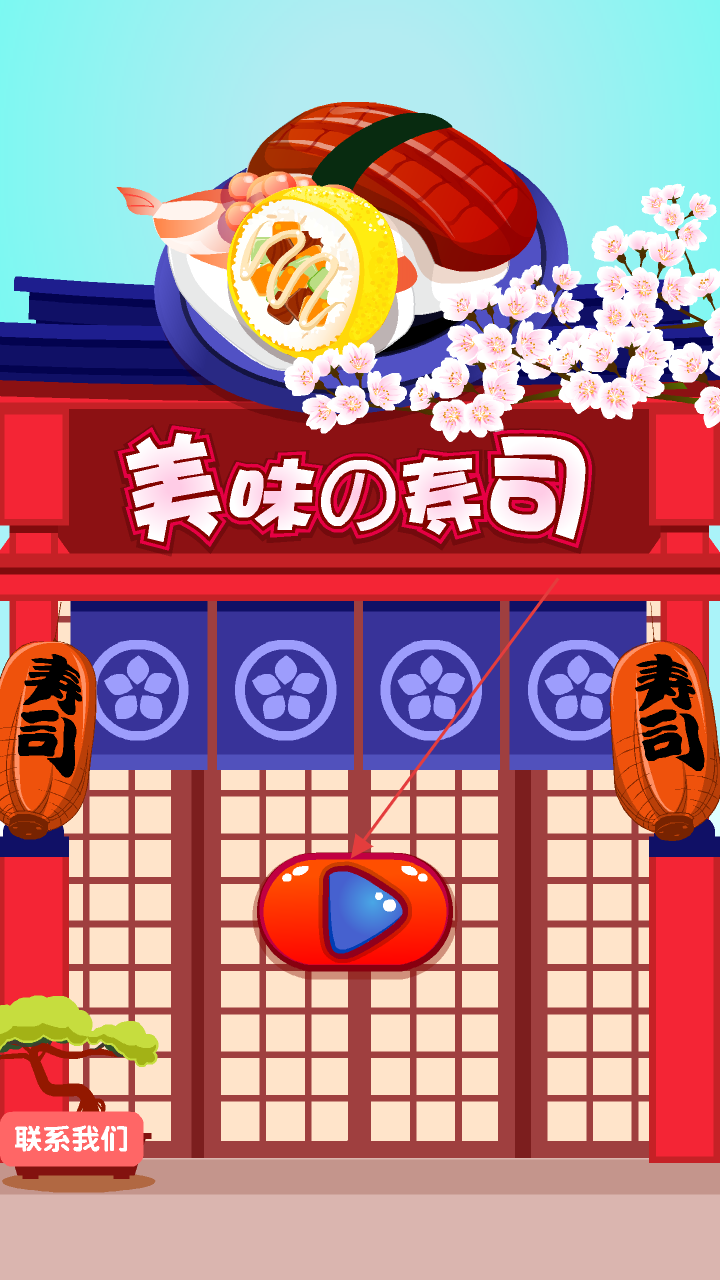 1、进入游戏启动界面,红色建筑上展示“美味の寿司”,上方有寿司与樱花装饰,点击中间红色播放按钮进入游戏,开启寿司制作之旅。