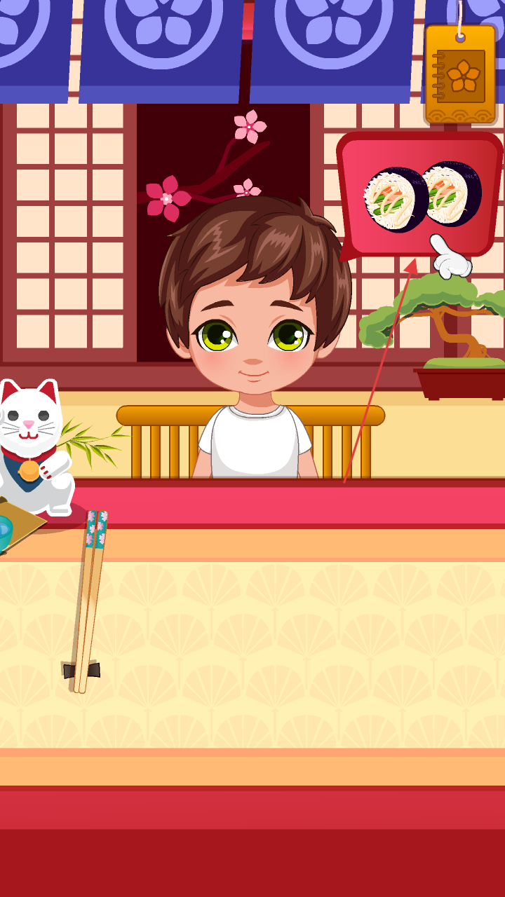 2、游戏内界面呈现卡通人物,旁边有招财猫与寿司图案,按提示点击相应寿司图案,选择制作目标,为后续制作步骤做准备。