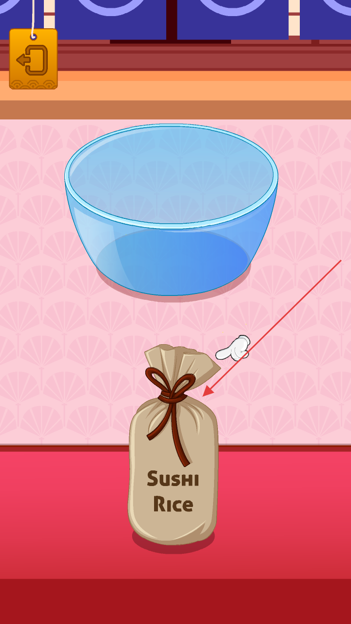 3、制作过程中,如出现标有“SushiRice”的米袋,按指示点击米袋,将寿司米倒入碗中,这是制作寿司的基础步骤,确保材料准备正确。