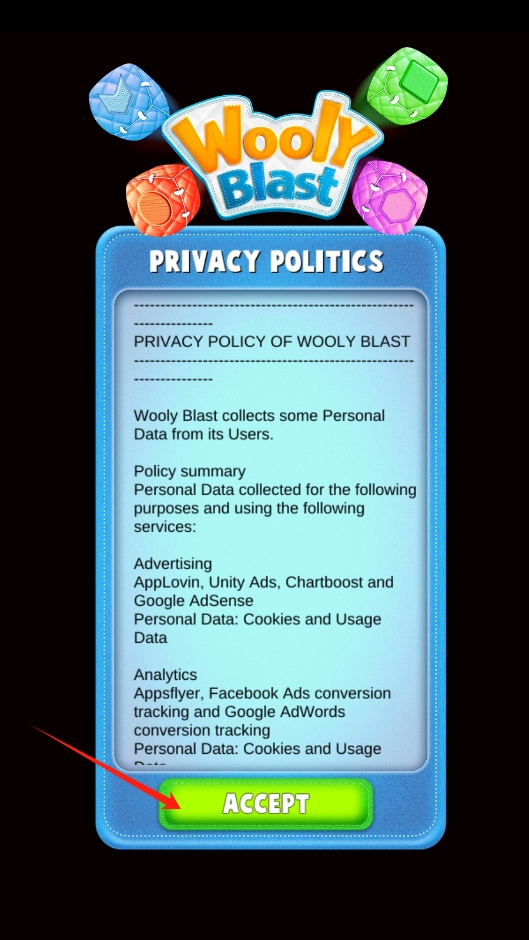 1、进入毛茸茸的爆炸,点击ACCEPT按钮同意隐私政策,开启游戏之旅。