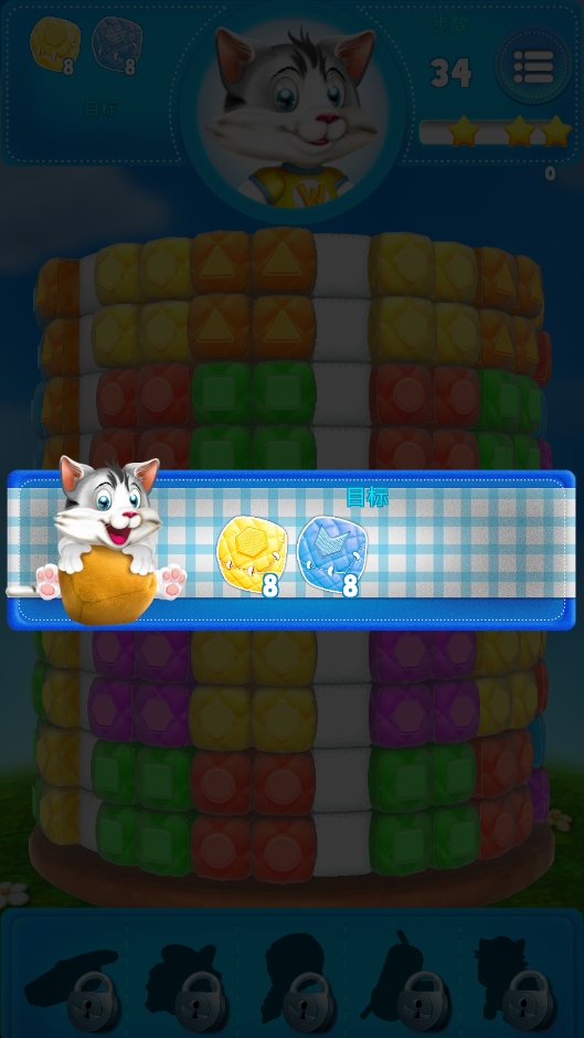 2、在关卡中,明确34步的步数限制和收集8个黄色,8个蓝色目标物的任务。