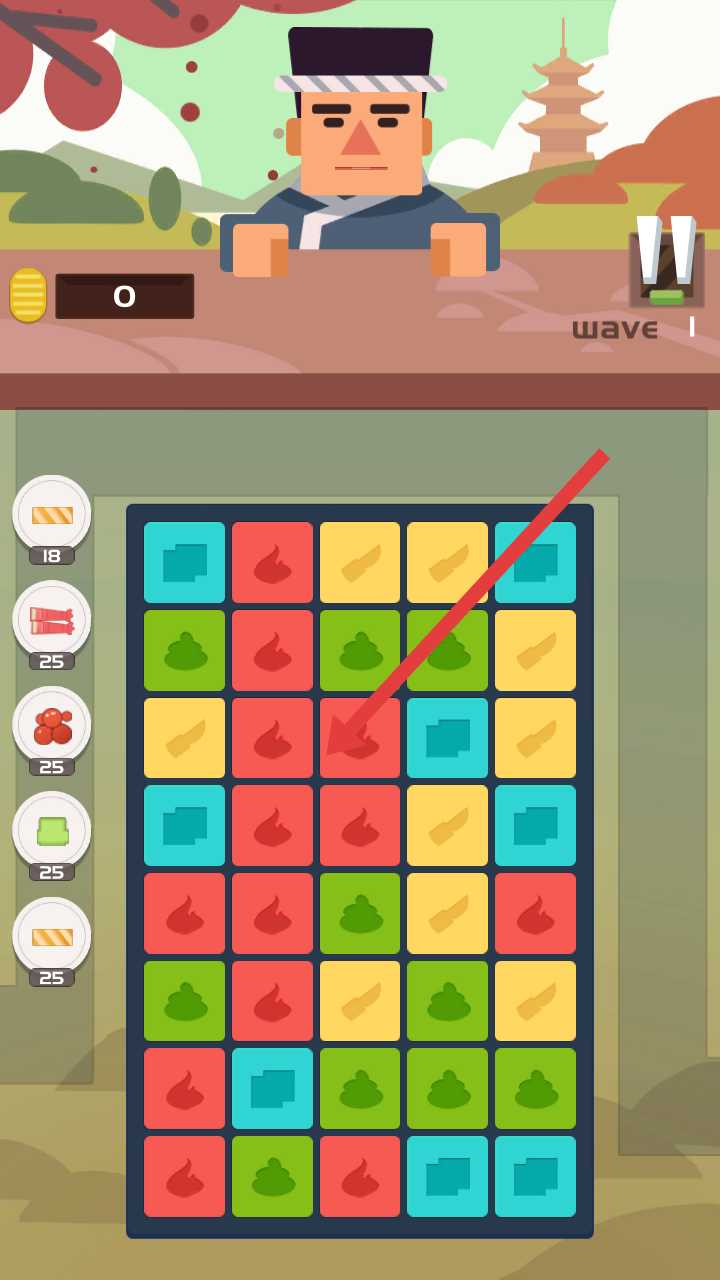 2、在这个游戏中,按箭头指示点击消除对应图案(如红色火焰图案),完成消除任务,获取分数。