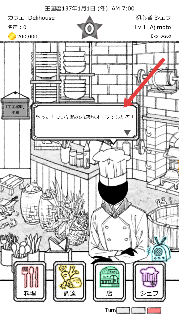 2、游戏初始界面,留意对话框提示“やった,ついに私のお店がオープンしたぞ”,熟悉下方功能按钮,开启店铺经营。
