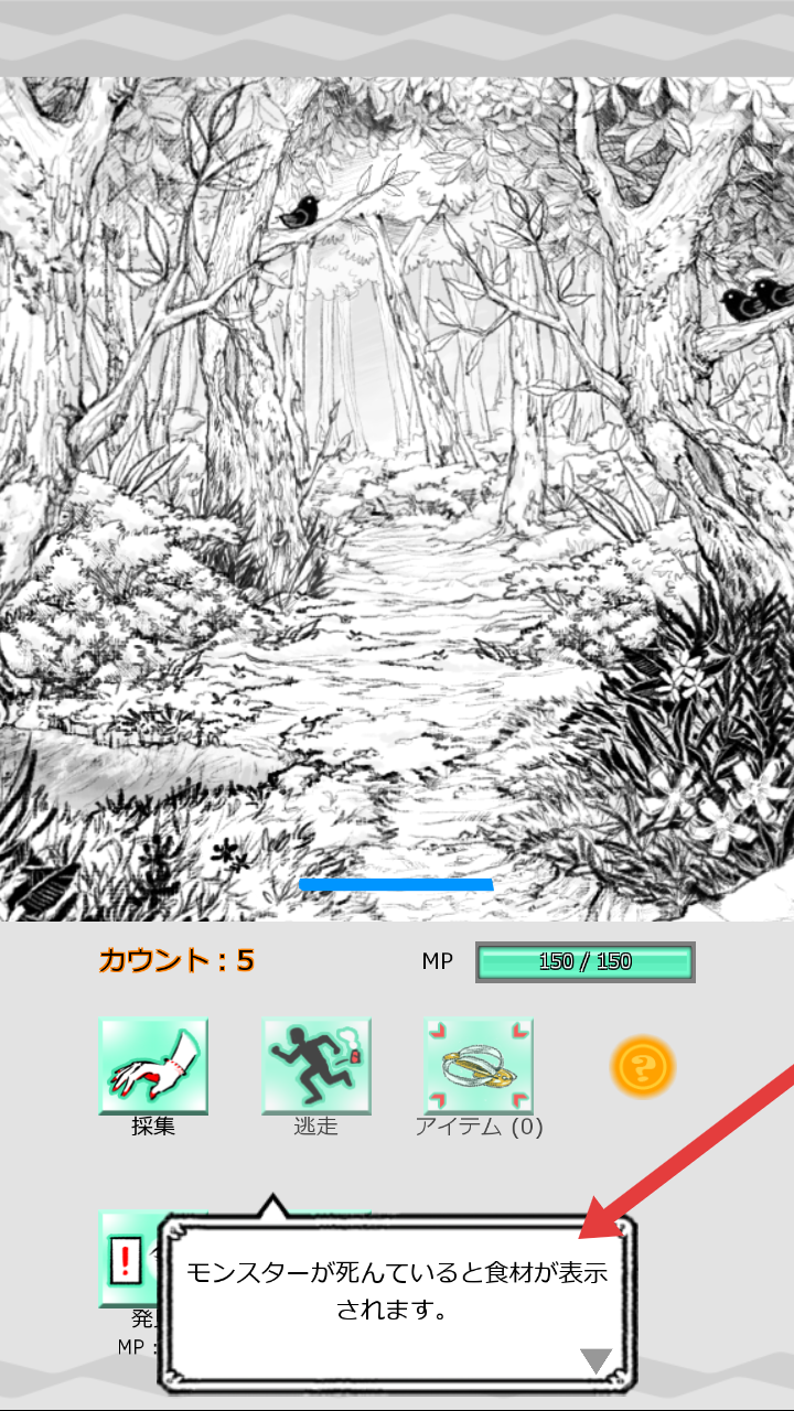 3、在森林场景中,注意提示“モンスターが死んでいると食材が表示されます”,根据提示操作,探索获取食材。