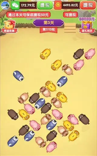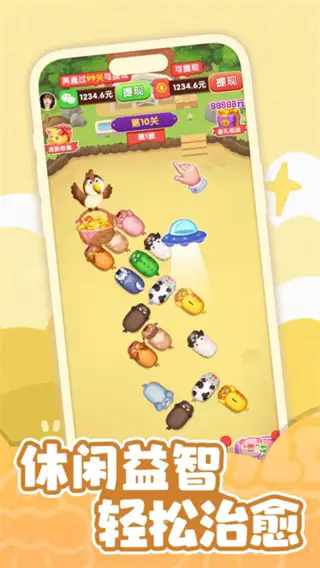 2、萌系角色设定:可爱小猪形象搭配治愈农场画风,消除过程中穿插小猪欢呼动画,带来愉悦视觉体验。