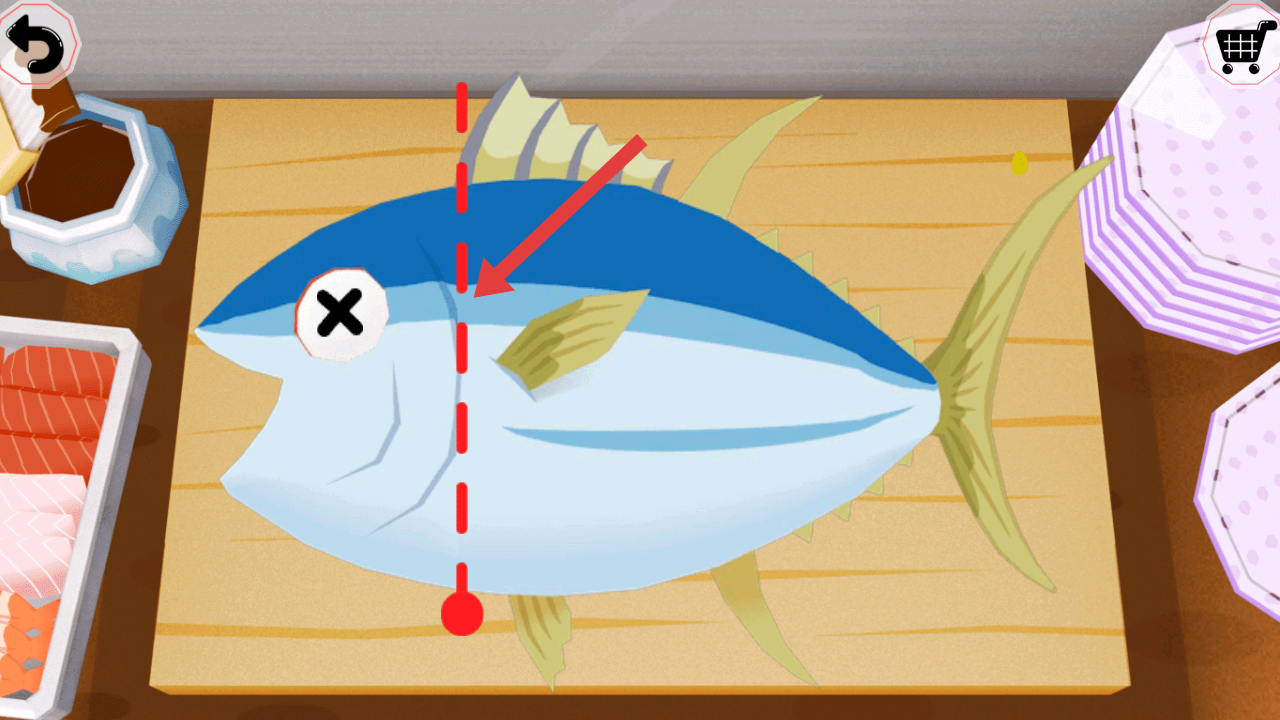 2、在切鱼界面按照红色虚线的指示来进行切割,完成变成生鱼片后的所有过程,装入碗中。