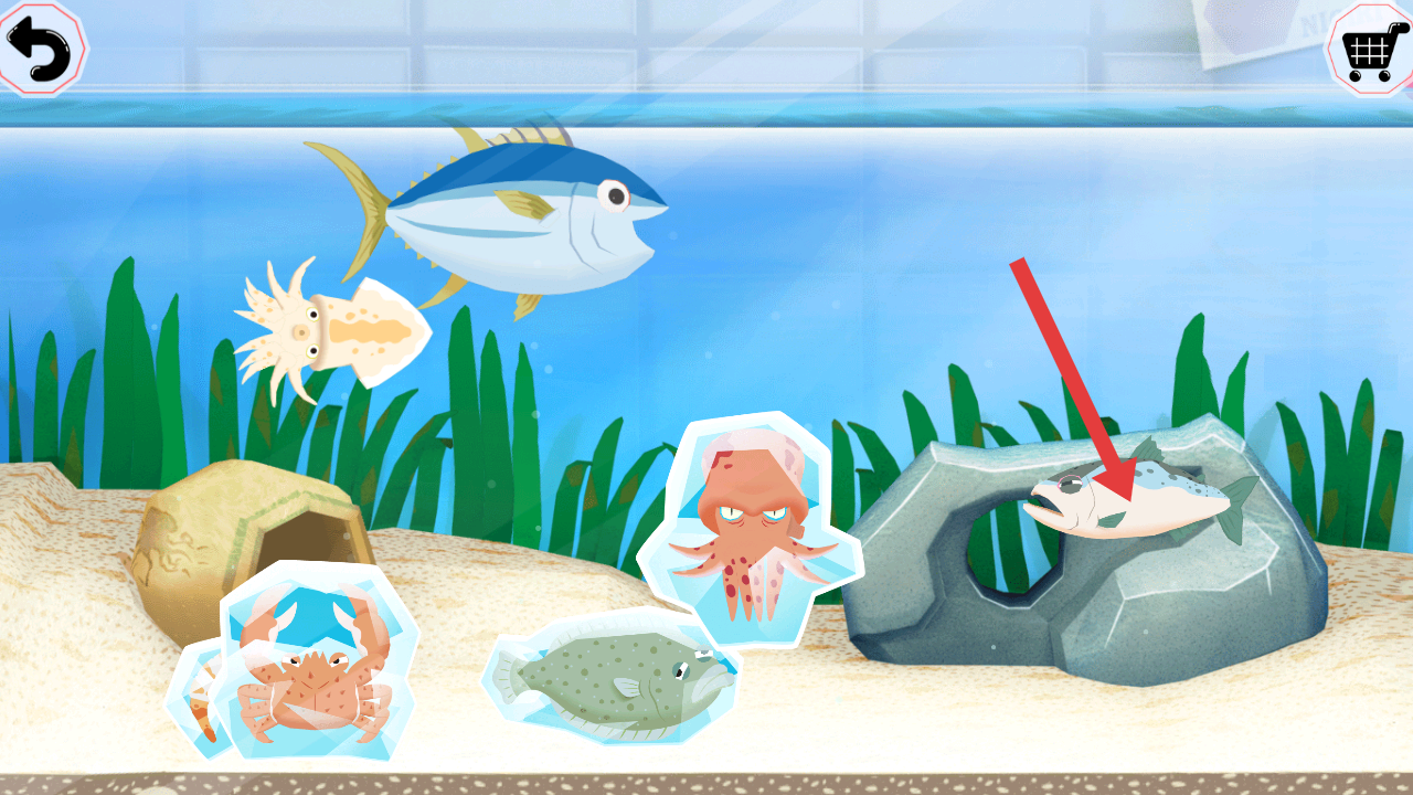 3、在做寿司前,客人会要求使用什么品种的鱼,然后在海底场景中找到客人要的鱼进行选择。