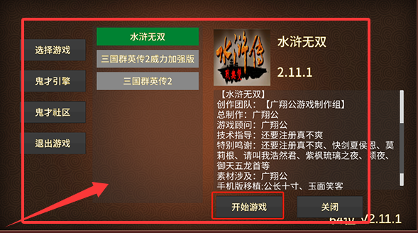1、进入游戏,我们选择“水浒无双”点击开始游戏等待片刻后,就可以载入游戏。
