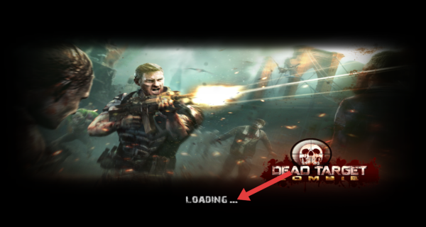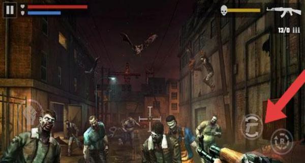3、在游戏内场景中,点击右下角的射击按钮(如箭头所指),对出现的僵尸进行射击,注意屏幕上方的生命值和弹药量。
