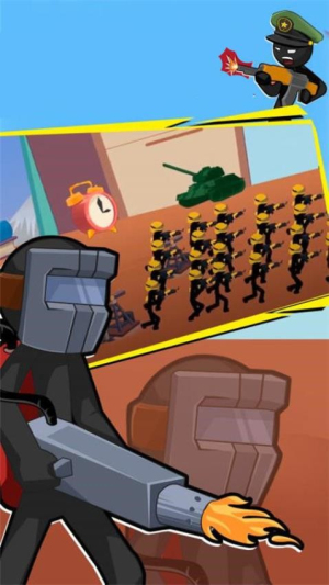 4、简约视觉表现,经典火柴人风格搭配精致的战斗特效。部队行动流畅自然,技能释放醒目直观,完美平衡策略深度与视觉清爽感。