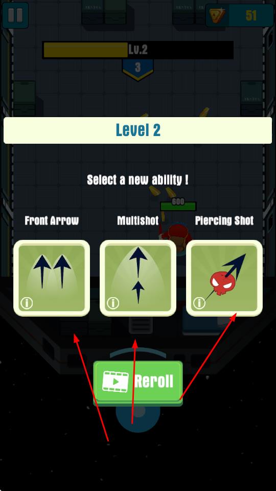 3、到达新关卡时,玩家可从“Front Arrow”“Multishot”“Piercing Shot”等新能力中选择,提升角色战斗能力。