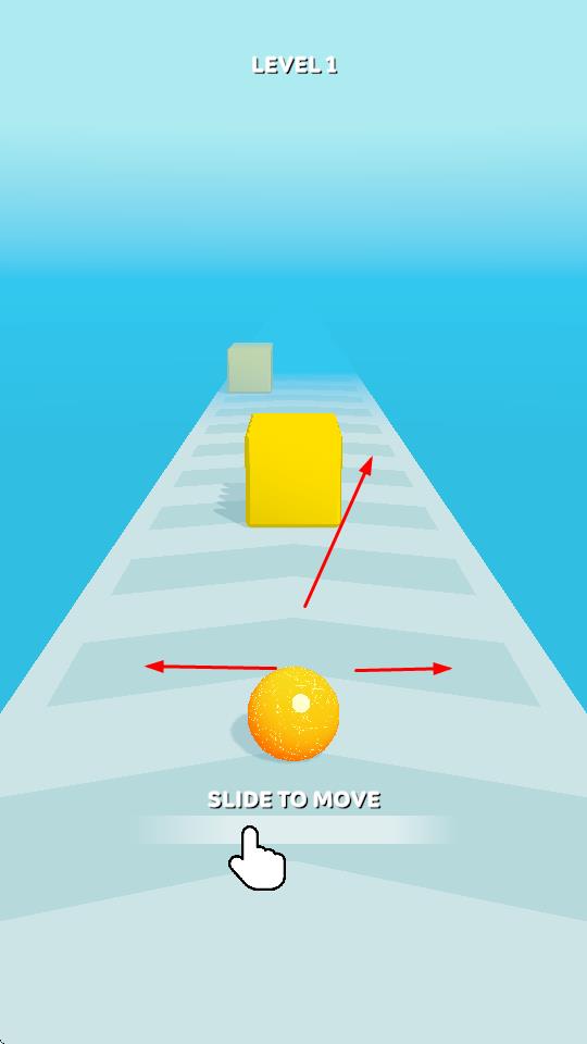 1、玩家通过滑动屏幕操控橙色小球在道路上移动,躲避黄色、蓝色等颜色的方块障碍物。