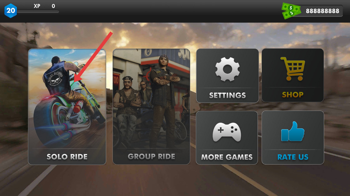 1、进入游戏可选择单人模式SOLO RIDE和多人模式GROUP RIDE,齿轮SETTINGS设置音效。