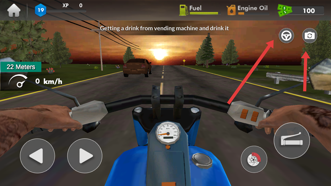 3、左侧控制车辆变道,右侧车把为油门,右上角有两个按键,可切换操控模式和视角。