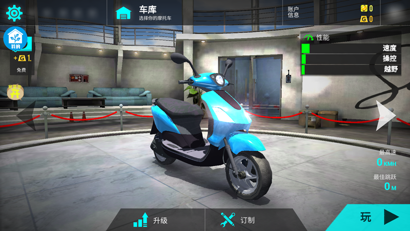 1、进入游戏主界面,首先选择一辆摩托车,也可点击升级对车辆进行改造涂装。