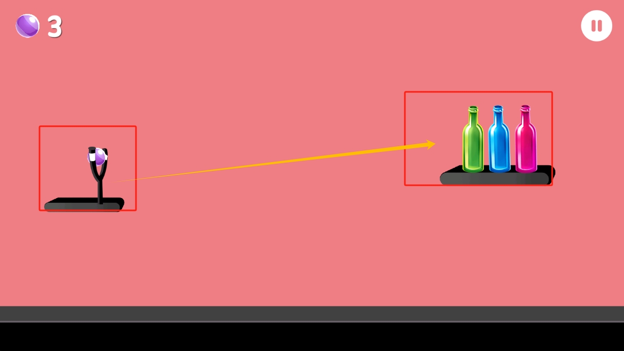 2、利用有限的弹球,如3个,瞄准并发射击倒彩色瓶子。
