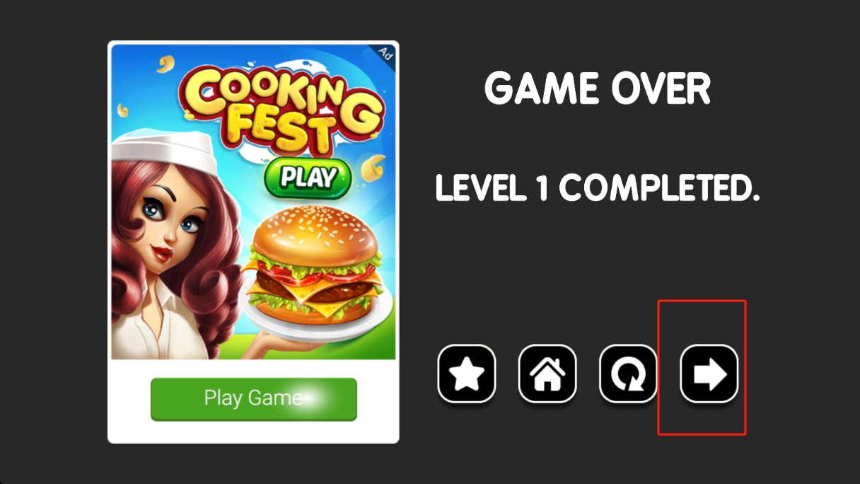3、完成关卡后看到GAMEOVER,点击箭头按钮,可继续开启新的关卡挑战。