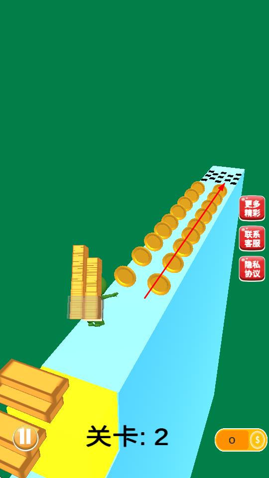 1、玩家操控绿色角色在道路上前进,收集金条、金币等物品,增加财富积累。