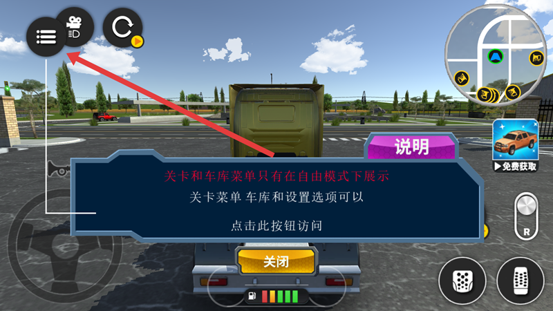 3、关卡和车库菜单只有在自由模式下展示,点击这个地方跳转到菜单界面。