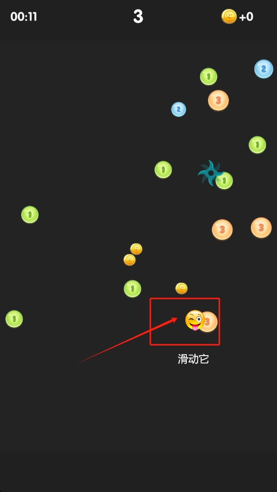 2、按照提示滑动表情图标,在规定时间内,与彩色数字球互动获取分数和金币。